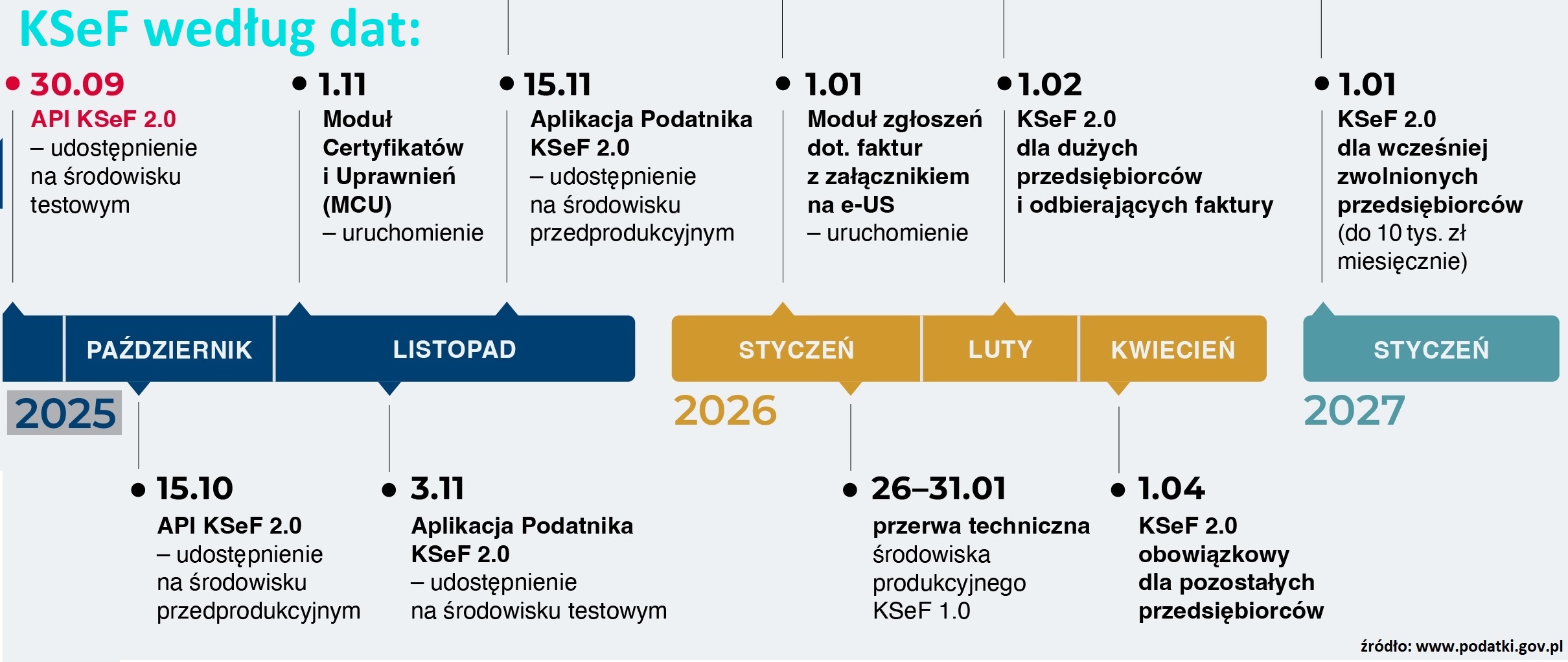 - Od 1 lutego 2026 do wystawiania faktur dla firm, które w 2024 roku miały sprzedaż z VAT powyżej 200 mln oraz dla pozostałych firm odbierających faktury.