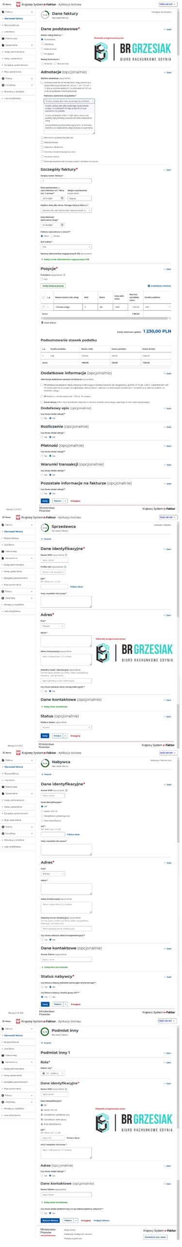 Wystawianie faktury w KSeF -darmowe lecz mocno czasochłonne i wymagające przez szereg wyborów i zaznaczeń (poniżej zrzut 4 stron, które trzeba uzupełnić by wystawić FV bezpośrednio w KSeF)